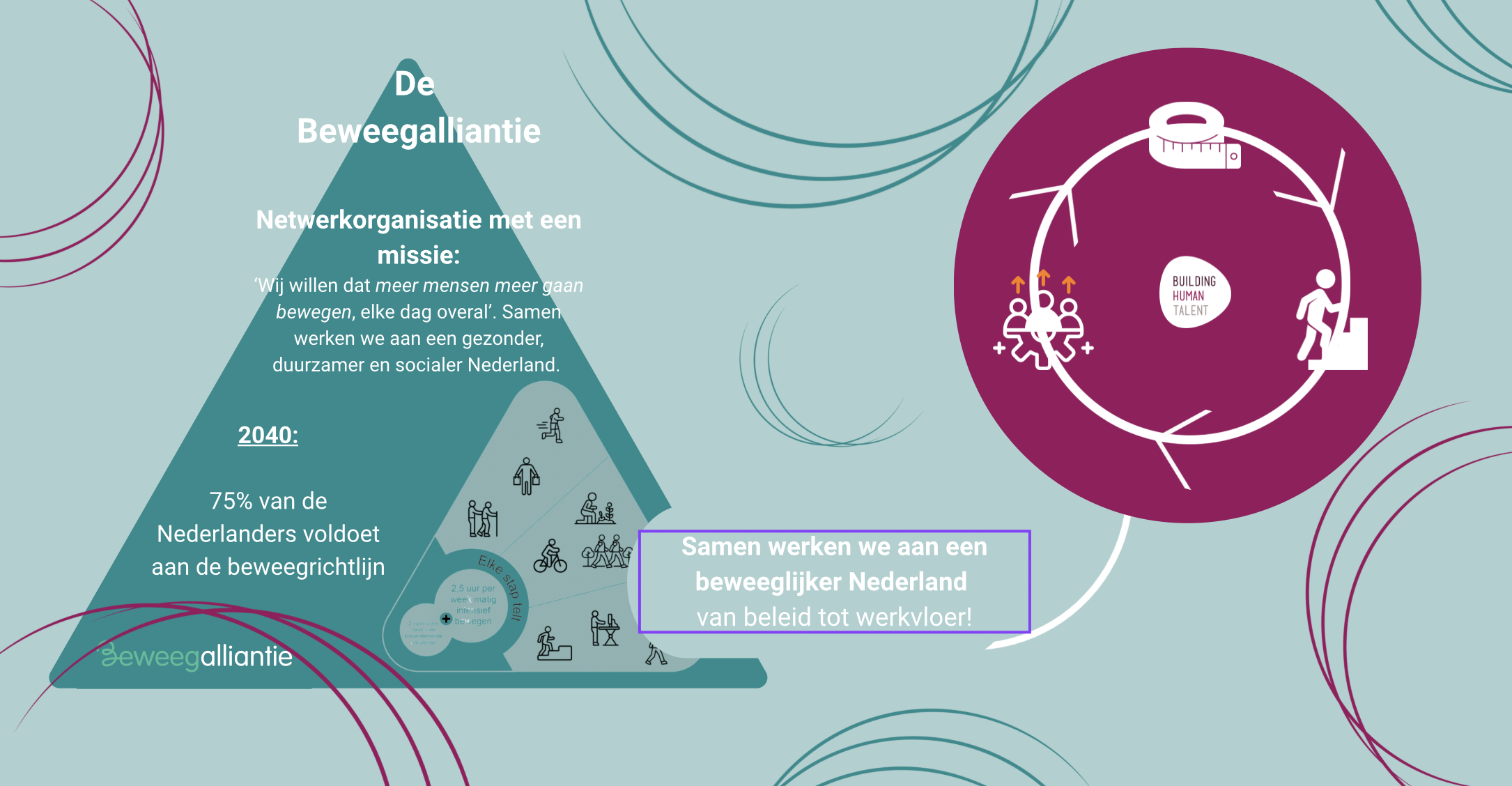 de Beweegalliantie — een landelijk netwerk dat zich inzet om meer mensen, elke dag en overal, in beweging te krijgen. Samen werken de partners aan één duidelijke missie: in 2040 voldoet 75% van de Nederlanders aan de beweegrichtlijn.