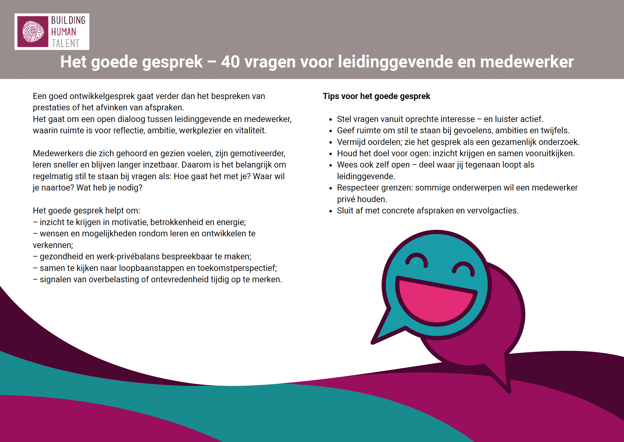 - Praktische tips voor het voeren van het goede gesprek.